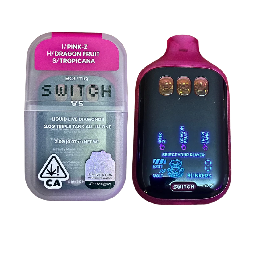 The BOUTIQ SWITCH V5 (3 in 1) Pink-Z x Dragon Fruit x Tropicana delivers a perfectly balanced cannabis experience by combining indica, hybrid, and sativa strains in one premium all-in-one disposable vape. Powered by Boutiq’s innovative Switch™ triple tank technology, this device allows you to seamlessly switch between three unique strain profiles anytime.Boutiq cannabis vape
