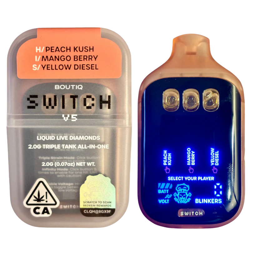 If you’re searching for a premium 3-in-1 disposable vape, the BOUTIQ SWITCH V5 Peach Kush x Mango Berry x Yellow Diesel is an excellent choice for variety and performance.boutiq switch carts