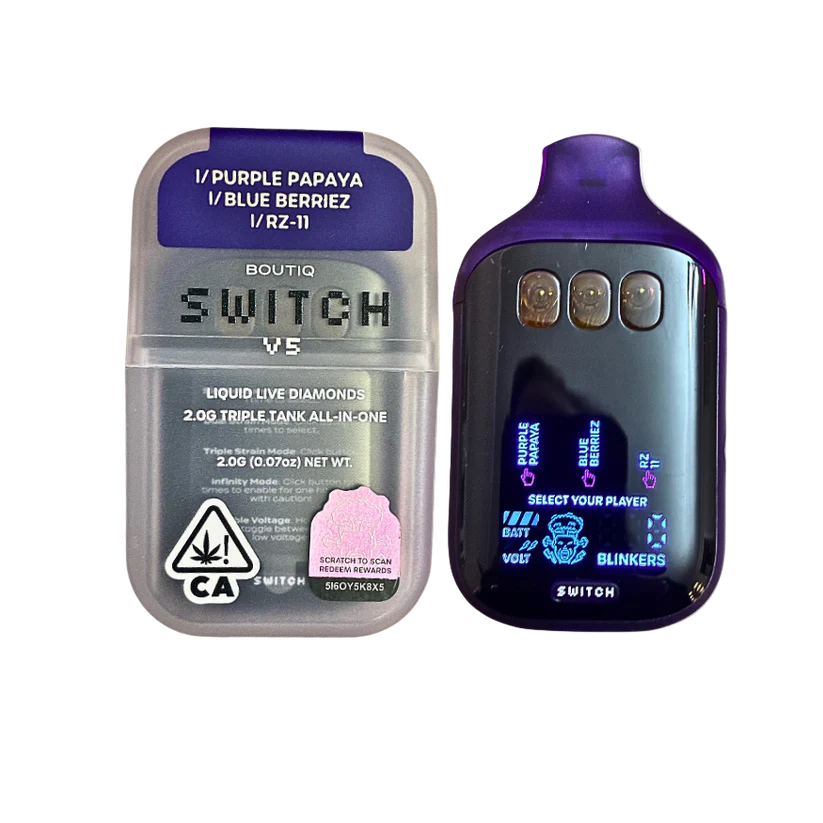 The BOUTIQ SWITCH V5 (3 in 1) Purple Papaya x Blue Berriez x RZ-11 is a premium indica-focused triple tank disposable vape designed for smooth relaxation, rich flavor, and consistent performance. Built with Boutiq’s advanced Switch™ triple tank technology, this all-in-one device allows you to seamlessly switch between three indica strain profiles in one sleek, easy-to-use vape.